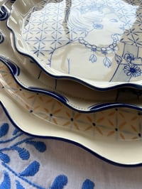 Fineste fad med østers og smukt mønster i nyde, blå og lyseblå. Perfekt til østers, kager, oste eller hæng den op på din billedvæg